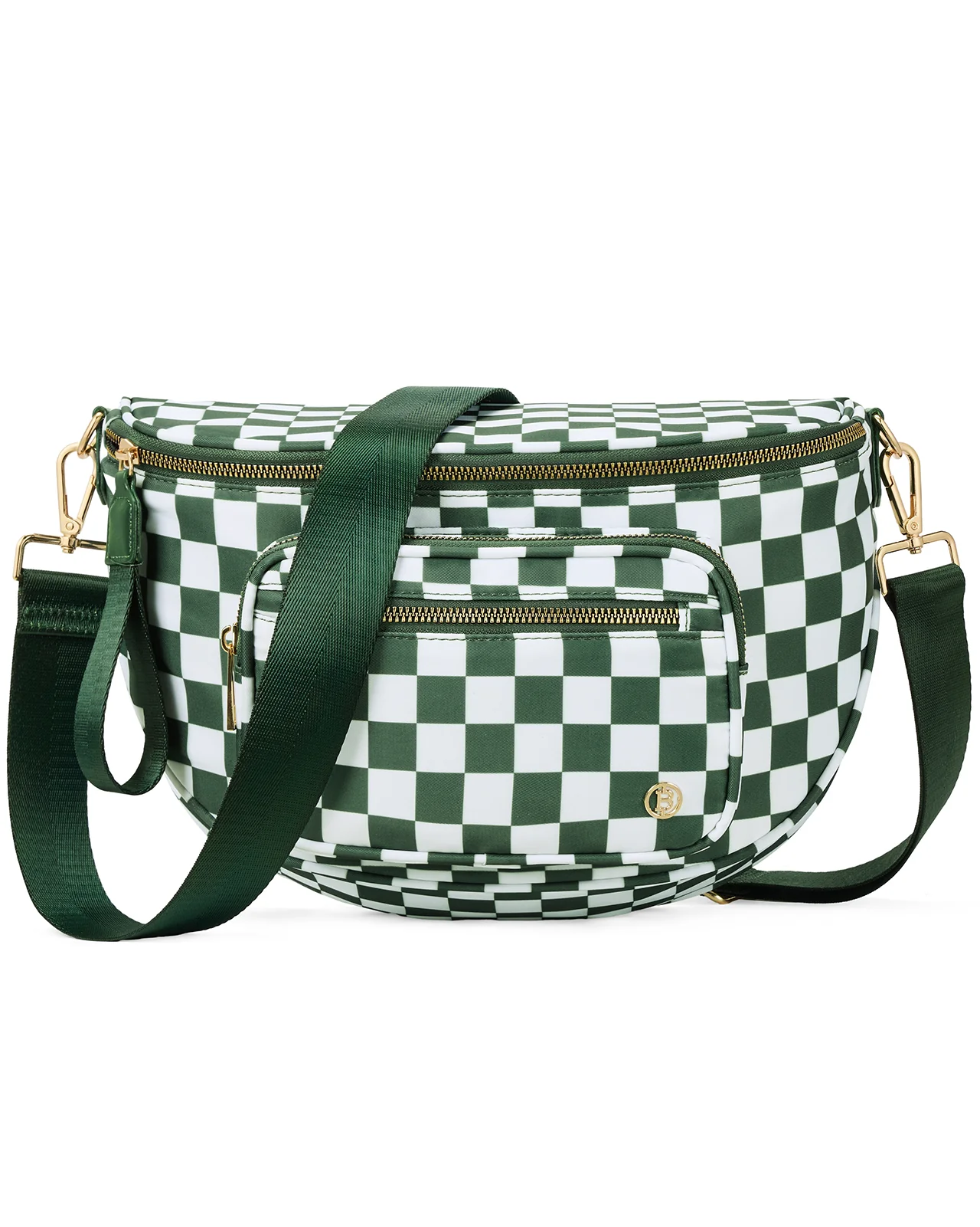 With its eye-catching checkerboard design, spacious 3-compartment layout, and room for essentials like a phone, wallet, and even a 24oz bottle, it keeps you organized on the go. Adjustable, detachable wide straps ensure comfort and allow for personalized styling. Perfect for daily wear, travel, or gifting, it delivers both standout style and everyday functionality.