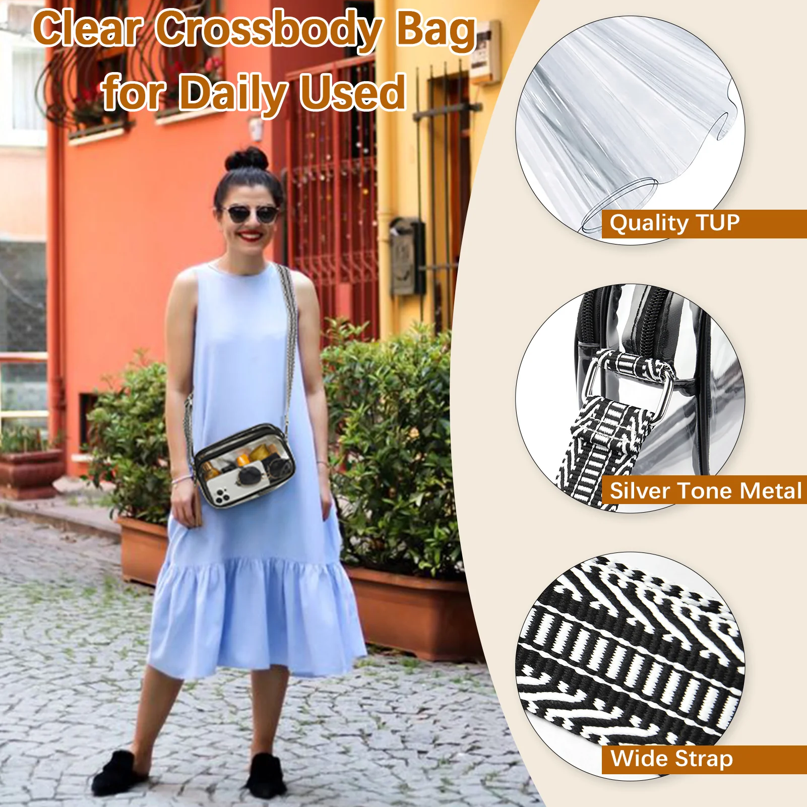 Perfect Size - The sturdy clear bag stadium approved size is 10.4L x 6.9H x 2.56W inch. It is big enough for you to put your phone, wallet, cosmetics keys, cash, cards, tickets in, etc. A convenient front pocket helps you hold small things for easy or frequent access daily. The crossbody bags for women are designed for maximum comfort and convenience.