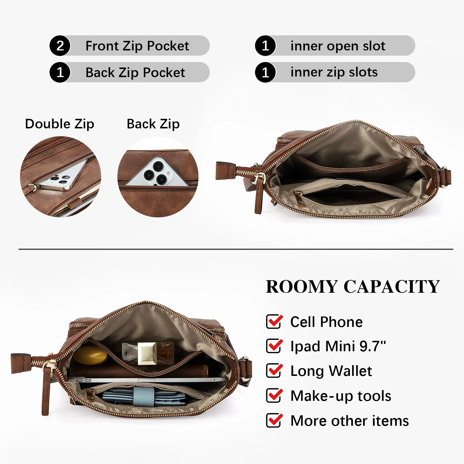 - ROOMY SPACE BUT LIGHTWEIGHT -- 1 x front big pocket + 1 x deep zipper + 1 back zip small pockets. Inside top zip compartment : Including main space with 1 zip slot + 1 open slots, Capable for storing your daily necessities,such as phone,keys, lipsticks, cash,coins,napkin paper and other small items,Fits most small tablet up to 9.7” inches.