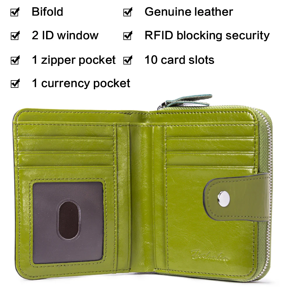 - Unique Features -- Roomy zipper pocket at the back. U-shape silver-color metal zipper around runs smoothly when being pulled open. You can put keys, coins and other tiny things in there. Two buttons closure designs make it stays closed and firm when stuffed. Best choice for avoiding bulky looking wallets.