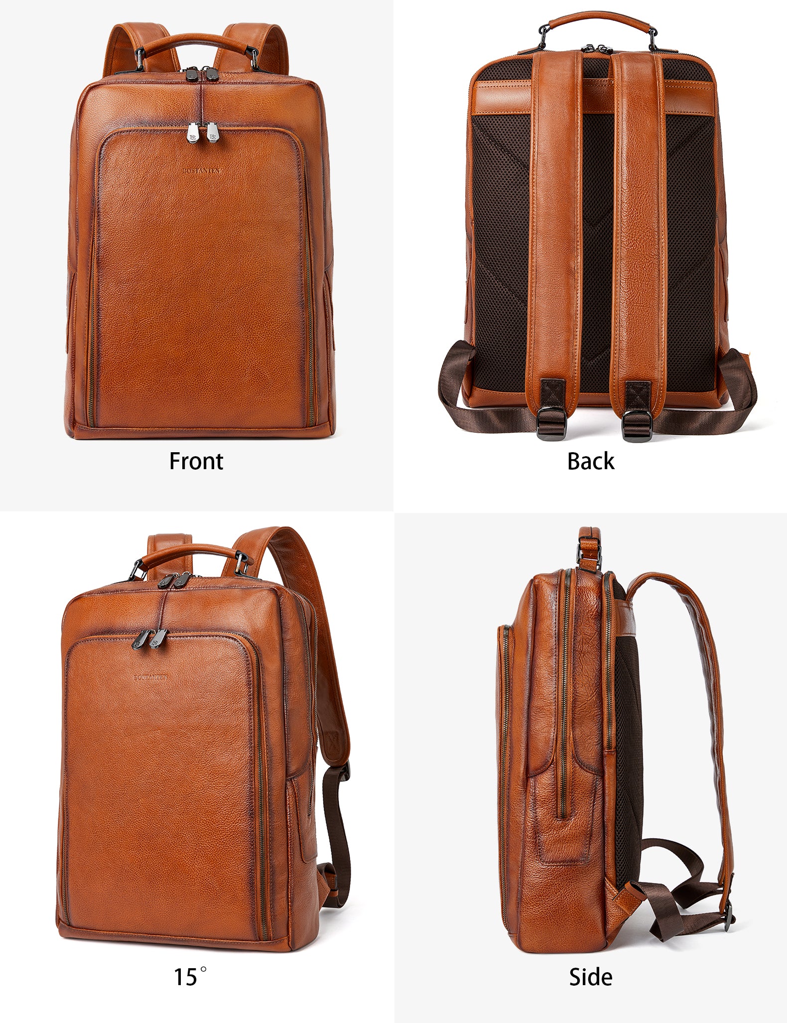 - ❖ VEGETABLE TANNED FULL GRAIN LEATHER: This leather laptop backpack is handcrafted from luxurious materials. Made of high-quality full-grain vegetable-tanned leather imported from Italy. The high-end design makes this backpack look vintage and fashionable, it is also a symbol of status and luxury. Top U zippers for your convenience, adjustable shoulder straps are comfortable and wouldn't dig into your shoulder. Comfortable airflow back design with thick but soft ensures great comfort.