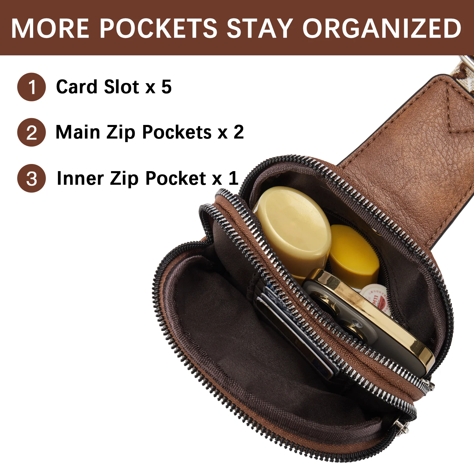 - Small Size, Large Capacity - Our leather sling bag with 3 pockets and 5 card slots, measures 1.77 x 5.5 x 7.87 inches. It may be small in size, but its interior is designed with a well-organized space to accommodate all your daily essentials such as wallets, phones, keys, and more